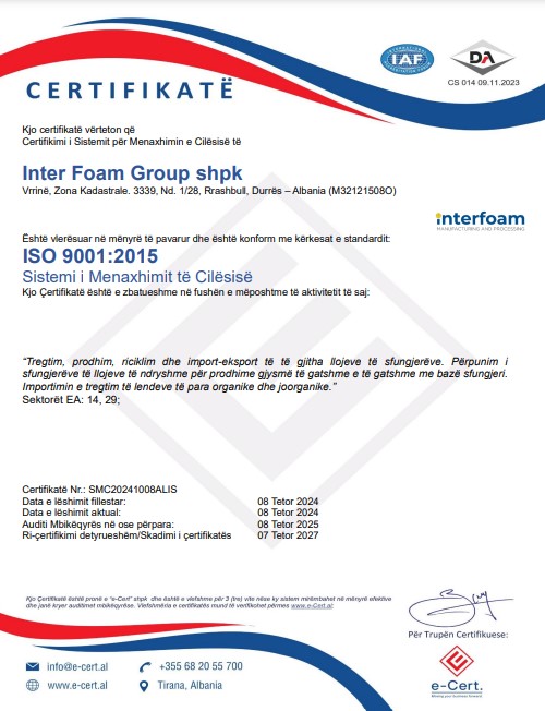 Interfoam është pionier në prodhimin e sfungjerëve ekologjikë në Shqipëri, duke ofruar një gamë të larmishme për përdorime të ndryshme. Me një fabrikë që operon me zero ndotje karboni dhe fokus në riciklimin e materialeve, ne jemi krenarë për angazhimin tonë për një industri të qëndrueshme dhe me cilësi të lartë. Qëllimi ynë është të sjellim inovacion dhe siguri në tregun e sfungjerëve, duke përmbushur nevojat e klientëve me produkte cilësore dhe ekologjike.